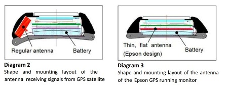 However, the angle of the mounting requires the device to be a certain thickness. Epson therefore designed an antenna with a new shape and a wider reception angle, and achieved a thin design by mounting the antenna alongside the battery (as shown in diagram 3). Epson also took care to make the thin design water resistant and minimize the number of components used. These efforts combined to enable the creation of a running monitor whose compactness, thinness and lightness makes it possible for runners to wear unobtrusively.