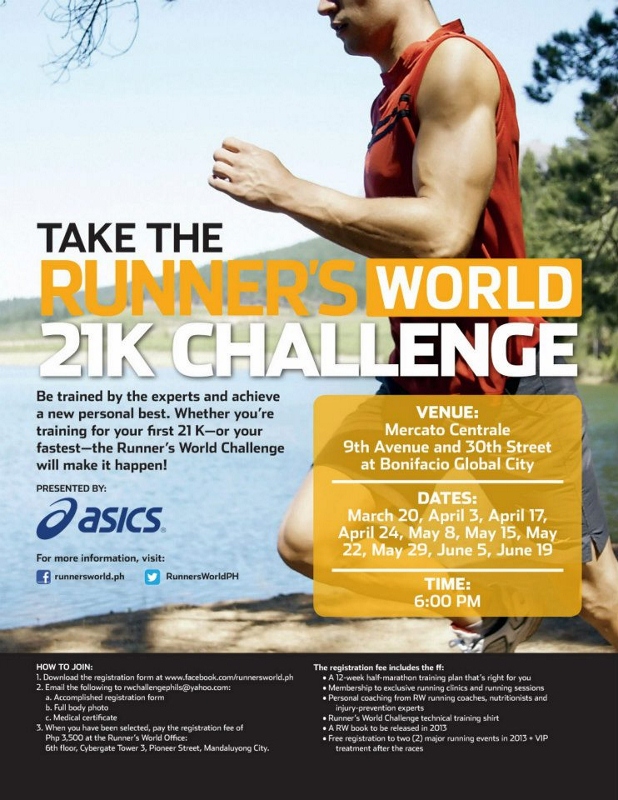 4. When you have been selected, pay the registration fee of Php3,500 at the Runner’s World Office at 6F, Cybergate Tower 3, Pioneer Street, Mandaluyong City.