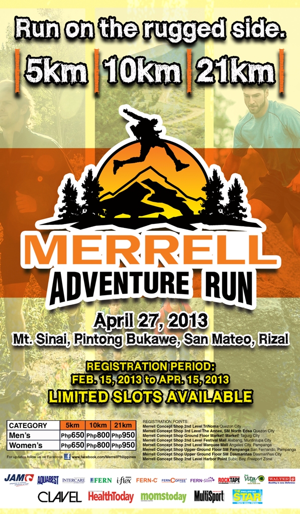 Register now at Merrell Concept Shops in Trinoma; Market! Market!; Festival Mall, Alabang; and Marquee Mall, Pampanga. Registration is extended until April 15, 2013. Registration fees are P650 for 5K, P800 for 10K, and P950 for 21K. Race kits include a timing chip, singlet, and bib number. Finishers’ shirts and medals will be given to the top 50 finishers of the 5K and 10K categories, as well as all the 21K category finishers.