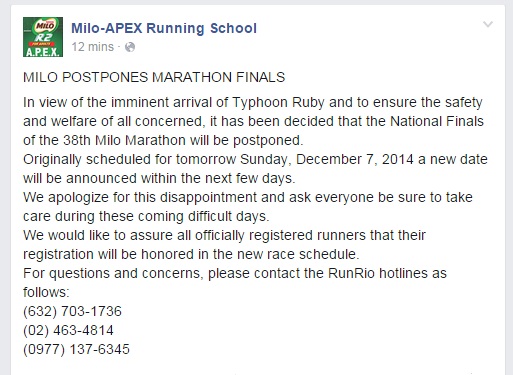 The 38th Milo Marathon Finals 2014, tomorrow, December 7, is POSTPONED due to Typhoon Ruby.