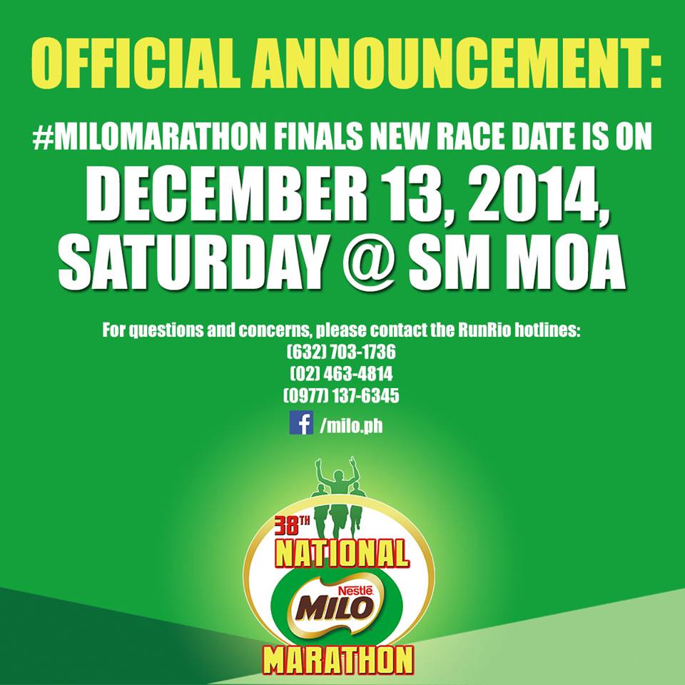 New date as officially announced: Milo Marathon 2014 Finals will be on December 13, 2014 in SM Mall of Asia Grounds