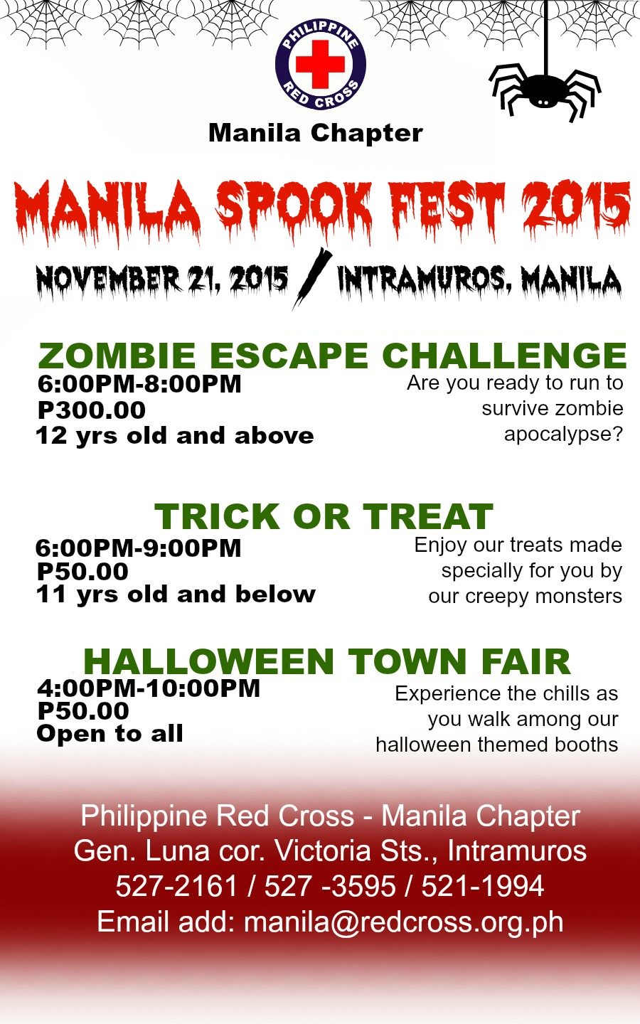 Halloween Parties have indeed gained an increasing popularity here in the Philippines for the past years. Children as well as adults look forward to the different themed events and activities on All Hallows Eve. In time for Halloween month, the Philippine Red Cross-Manila Chapter will be having its 1st Halloween Event entitled, “Manila Spook fest 2015”. The proceeds of this event will support the preparedness campaign of the Philippine Red Cross-Manila Chapter in anticipation of the “Big One”.