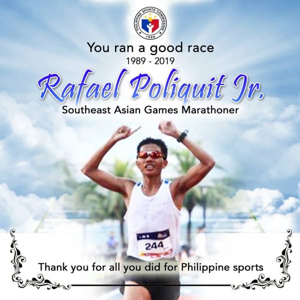 National marathon champion Rafael Poliquit Jr passed away on April 11 at 2:21 pm at V. Luna Medical Center due to complications from subdural empyema, according to the Philippine Sports Commission.