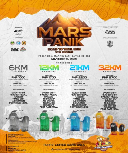 New trails. New distances. New challenge! The Mars Panik Trail Run 5th Edition is coming this November 16, 2025. Set in the breathtaking trails of Maragusan, Davao de Oro, the Nature Adventure Destination Capital of the region!