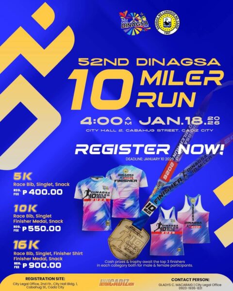 Run with purpose and celebrate the vibrant spirit of Dinagsa 2026! Join the 52nd Dinagsa 10-Milers Run on January 18, 2026 (4:00 AM) at City Hall 2, Cabahug Street, Cadiz City.