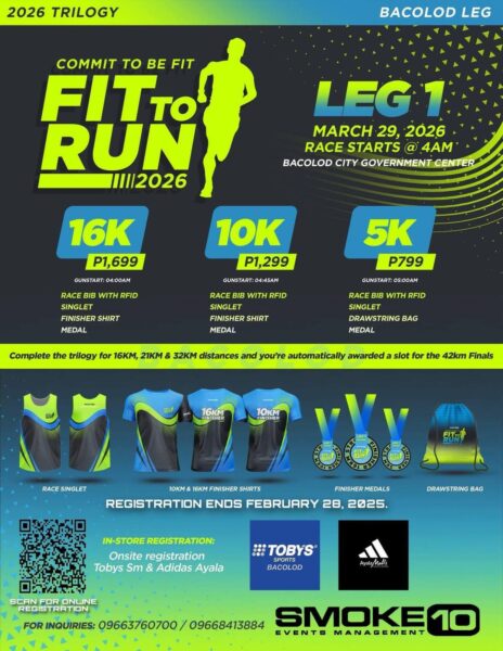 Smoke10 Events Management presents: FIT TO RUN BACOLOD LEG 1- 2026. For the benefit of Heartbeat of the Mission Foundation. Everyone is welcome to join. Gear up! Lace up those running shoes, let’s have fun, and continue to commit being fit this 2026!