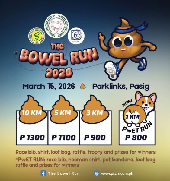 The Bowel Run 2026 is the annual fundraising event organized by the Philippine Society of Colon and Rectal Surgeons (PSCRS) in support of Colorectal Cancer Awareness Month. The third edition will be in collaboration with the Philippine Society of Digestive Endoscopy (PSDE) and the UP Association of Biology Majors (ABM), and is happening on March 15, 2026 at Parklinks, Pasig City.