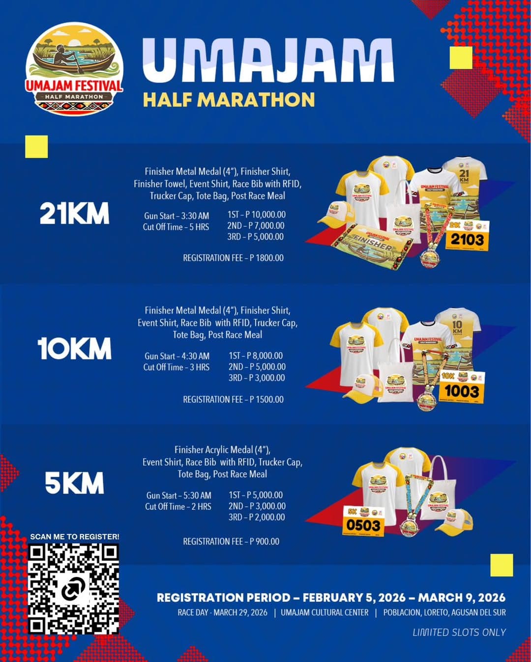 Lace up for the Umajam Half Marathon 2026 and celebrate the vibrancy of Manobo culture and the warmth of our people at 21st Umajam Festival and 61st Araw ng Loreto! Whether you’re chasing a personal best or simply running for the joy of it, let us make every stride...