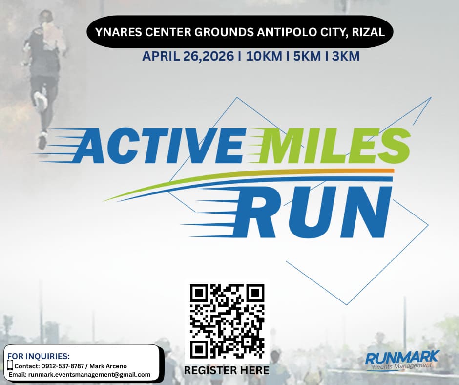 The Fun Run is dedicated to connect communities, inspired individuals and celebrate every step through a meaningful well- organized running events. Active Miles Run 2026April 26, 2026 Ynares Center Grounds, Antipolo City EVENT DISTANCES 3KM,5KM,10KM REGISTRATION FEES RegistrationFebruary 01-March 31,2026 3KM: PHP9995KM: PHP1,09910KM: PHP1,299 WHERE TO REGISTER Online Registrationhttps://form.jotform.com/253483566663468 CONTACT PERSONS Mark...