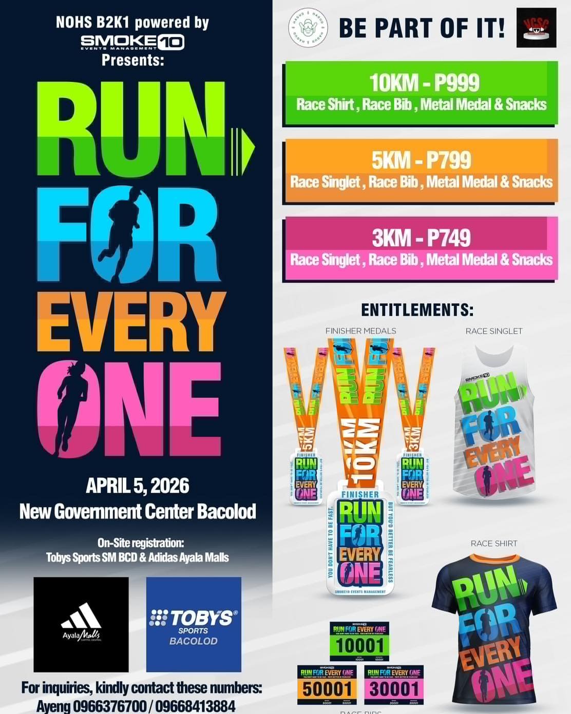 NOHS BATCH 2001 – “RUN FOR EVERYONE”April 5, 2026New Government Center, Bacolod City EVENT DISTANCES 3K | 5K | 10K REGISTRATION FEES 3KM – 7495KM – 79910KM – 999 WHERE TO REGISTER Onsiteadidas – Ayala MallToby’s Sports – SM Bacolod...