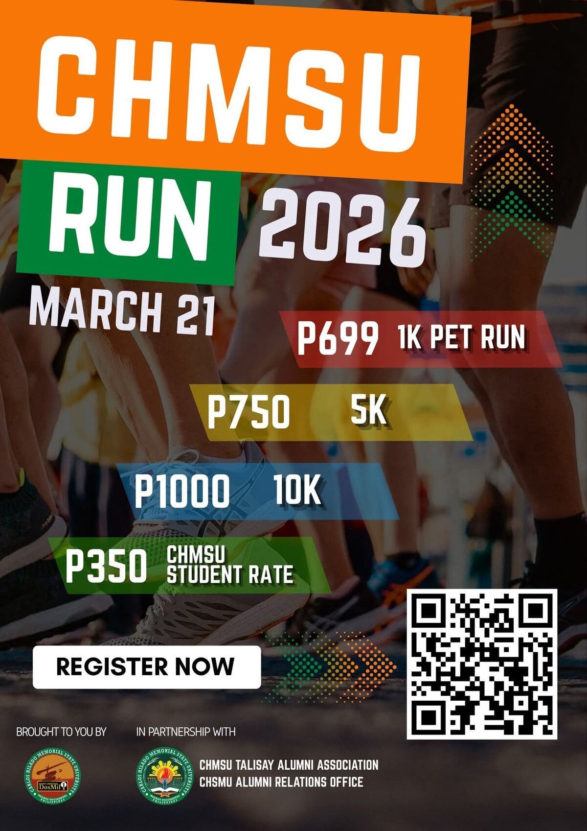 CHMSU RUN 2026 is happening — and yes, pets are welcome. Whether you’re running, walking, or just in it for the fun, there’s a category for you. CHMSU Run 2026March 21, 2026 EVENT DISTANCES 1KM, 5KM, 10KM REGISTRATION FEES 1K Pet Run – ₱6995K Run – ₱75010K Run –...