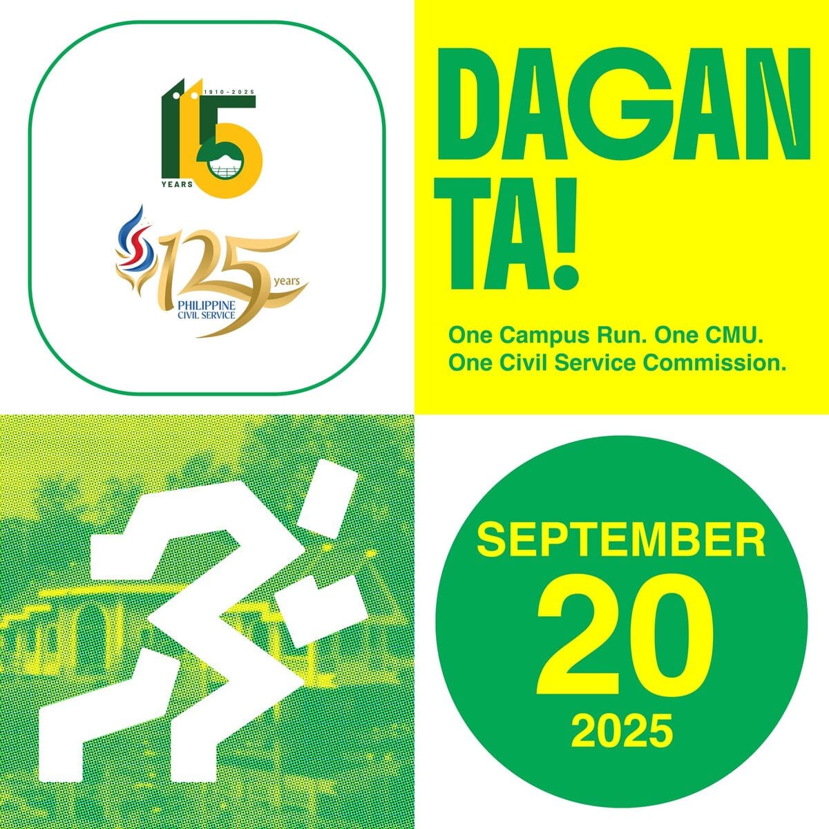 Join us this September 20, 2025 for a meaningful run as part of CMU’s 115th Unified Foundation Celebration and the 125th Philippine Civil Service Anniversary! Dagan Ta! One Campus Run. One CMU. One Civil Service Commission.September 20, 2025CMU Campus, Musuan, Maramag, Bukidnon EVENT DISTANCES 3KM, 5KM, 10KM REIGSTRATION FEES...