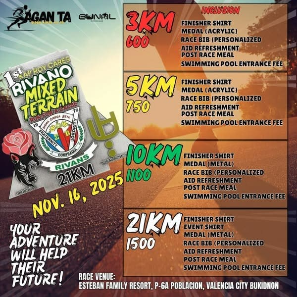 The event is a Mixed Terrain Run For A Cause which the runners will experience a pavement, off road and trails along the route. the event will raise a fund to support less fortunate students of Sitio Kiulom, Dangcay, Kitaotao, Bukidnon. 1st Rivano Mixed Terrian Run For A CauseNovember...