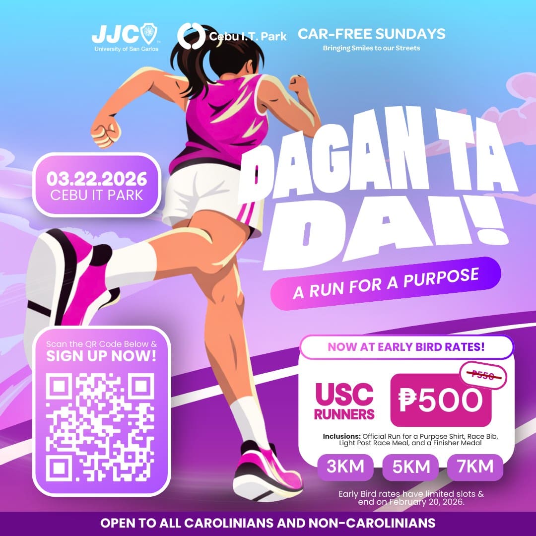 Dai naa daw fun run sa IT Park inig March 22, tinuod ni? Sakto kaayo dai! USC JJC, in partnership with Cebu IT Park, presents DAGAN TA DAI: A Run for a Purpose! Take a run around Cebu IT Park this March 22, 2026 from 4:30 AM to 9:00...