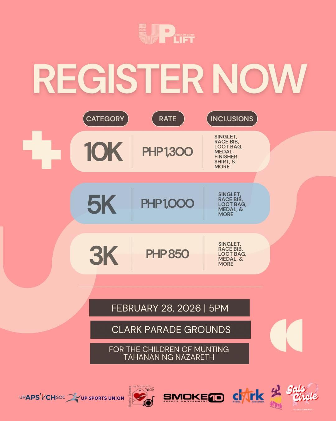 UPlift Run 2026February 28, 2026Clark Parade Grounds EVENT DISTANCES 3KM, 5KM, 10KM REGISTATION FEES 3KM – 8505KM – 100010KM – 1300 WHERE TO REGISTER Online Formhttps://tinyurl.com/499rspyc Visit FB Pagehttps://www.facebook.com/UPlift2026...