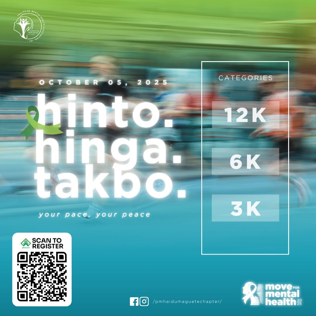 Join the Philippine Mental Health Association, Inc. – Dumaguete Chapter this October 5, 2025 as we move together for mental health awareness and emotional well-being. Join us for a run that goes beyond the finish line. Hinto. Hinga. Takbo.October 5, 2025Dumaguete City, Negros Oriental EVENT DISTANCES 3KM, 6KM, 12KM...