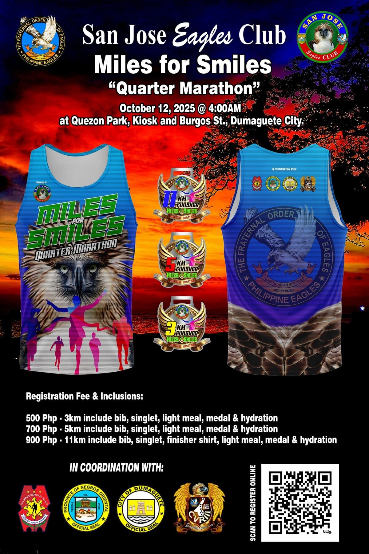 Join us for the Miles for Smiles Quarter Marathon on October 12, 2025 in Dumaguete City! This exciting run features 3km, 5km, and 11km distances, complete with race kits, medals, hydration, and more. Proceeds will go towards community projects and charitable causes. Miles for Smiles Quarter MarathonOctober 12, 2025...