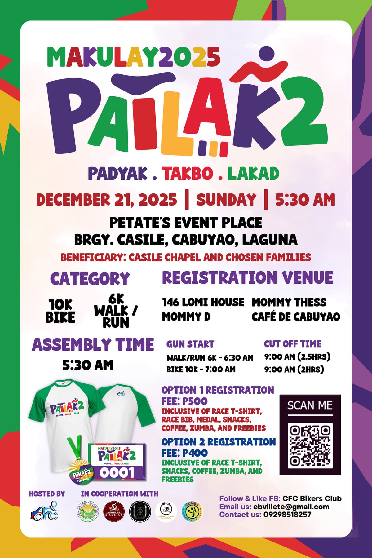 A Fundraising Project of CFC Bikers Club for the benefit of Casile Chapel and chosen families Patlak 2025December 21, 2025Brgy.Casile Cabuyao Laguna EVENT DISTANCES 6k Walk/Run10k Bike REGISTRATION FEES OPTION 1 REGISTRATION FEE: P500(Inclusive of Race T-shirt, Race Bib, Medal, Snacks, Coffee, ZUMBA, and Freebies) OPTION 2 REGISTRATION FEE: P400(Inclusive of Race...