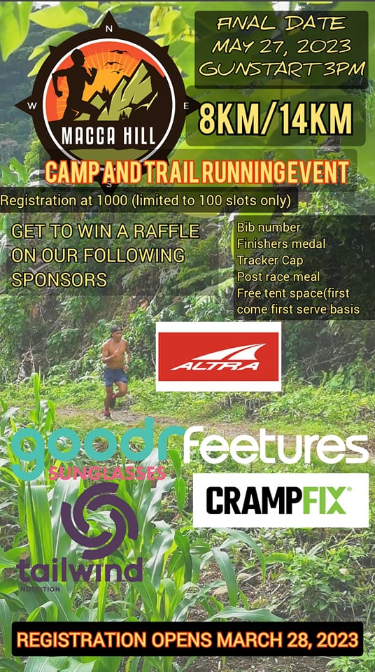 Macca Hill Camp and Trail Running Event 2023 is on Saturday May 27, 2023 at MACCAHILL Purok Magtahos Barangay Minoyan, Murcia in Negros Occidental. Gunstart is at 3pm, going towards after party. Don’t think of it as Hill. Think of it as a challenge you will over come, and...