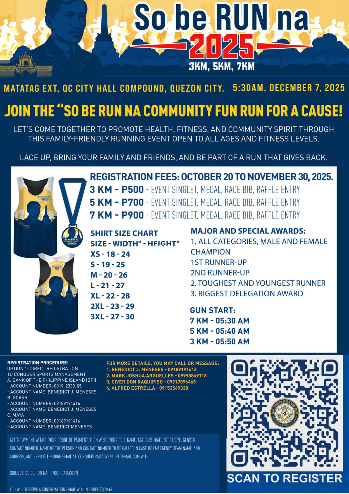 In celebration of QCPD’s 83rd Founding Anniversary entitled “Tagapaglunsad ng Malasakit”. A weeklong festivities to be kicked-off by a community run for all. Come one, come all and let’s have fun together. Quezon City PNP is opening its gate to all athletes and families. This run for a cause...