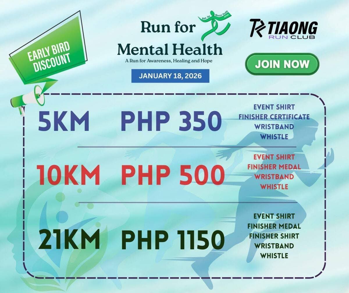 Join us to support our community service projects and help uplift minds. A Run with Purpose. A Step Toward Healing. Run for Mental Health 2026Date: JANUARY 18, 2026Escueta Alaala Park, Tiaong, Quezon EVENT DISTANCES 5KM, 10KM, 21KM REGISTRATION FEES Regular Rate (December 1 to January 11)21KM – ₱1,40010KM –...