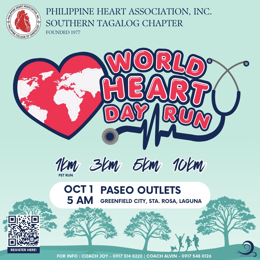 Use heart for every heart! Let us help increase awareness of cardiovascular diseases, advocate steps to prevent cardiovascular disease and promote lifestyle modification. Join the World Heart Day Run on October 1, 2023 at Paseo Outlets, Greenfield City, Sta. Rosa, Laguna! Assembly time will be at 5AM! World Heart...